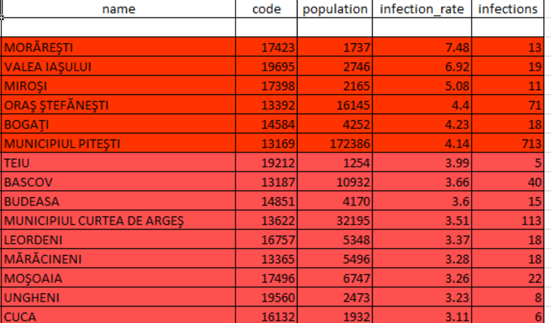 Potrivit Direcției de Sănătate Publică (DSP), la această oră 15 localități din județul Argeș se află în scenariul roșu: