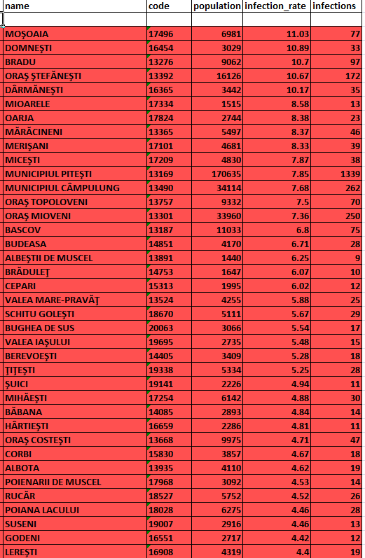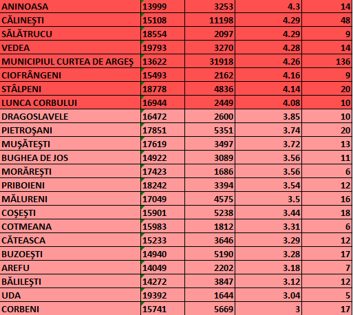 Lista localităților argeșene aflate în prezent în scenariul roșu din punct de vedere epidemiologic: