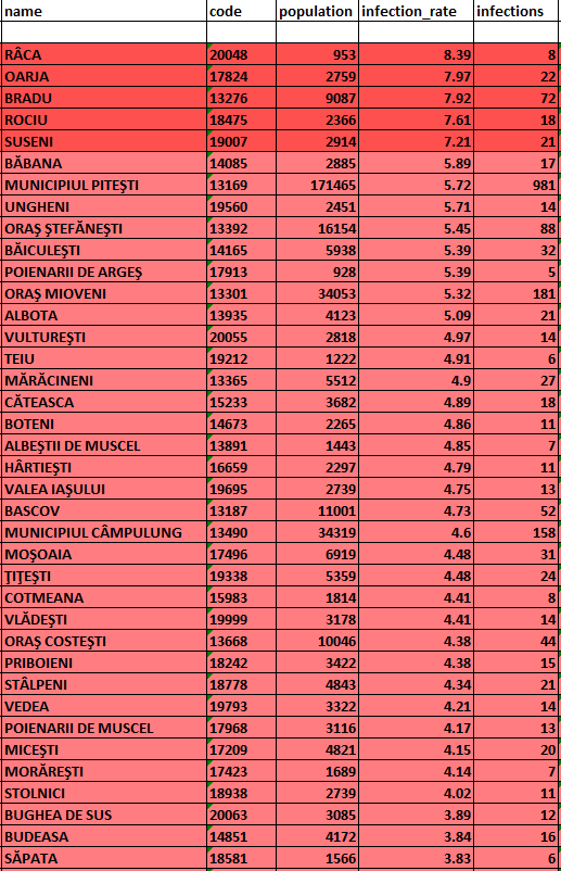 Cu puțin timp în urmă, Direcția de Sănătate Publică a actualizat lista localităților din județul Argeș care sunt în scenariul roșu din punct de vedere epidemiologic (click pe imagini pentru vizualizare):