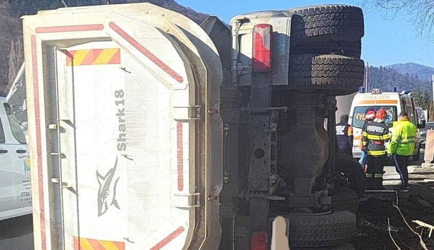 Este vorba despre un ansamblu rutier fără încărcătură, care s-a răsturnat pe partea carosabilă, blocând sensul de mers către Brașov.