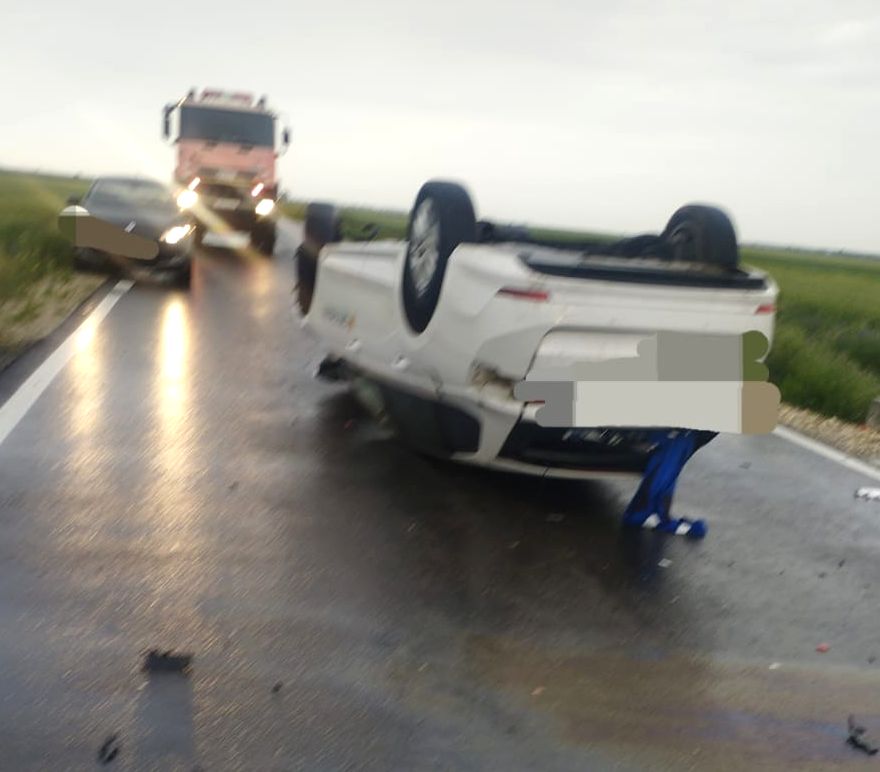 Din impact, primul autoturism s-a răsturnat pe partea carosabilă, iar al doilea a intrat în șanț.