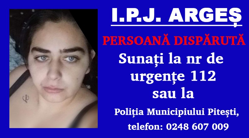 Cei care pot oferi informații care să ajute la găsirea femeii sunt rugați să sune la Serviciul Unic de Urgenţă 112 sau să ia legătura cu Poliția Municipiului Pitești, la numărul de telefon 0248.607.009.