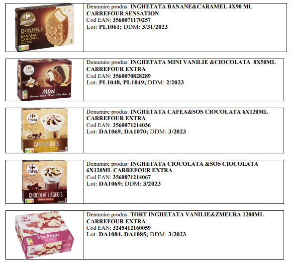 Ca urmare a unei notificări primite din partea producătorului Froneri (Franța), Carrefour România a inițiat retragerea de la comercializare și rechemarea de la clienți a mai multor produse alimentare. Motivul: prezența oxidului de etilenă în aditivul folosit (guma de Carruba) în fabricarea acestor produse.