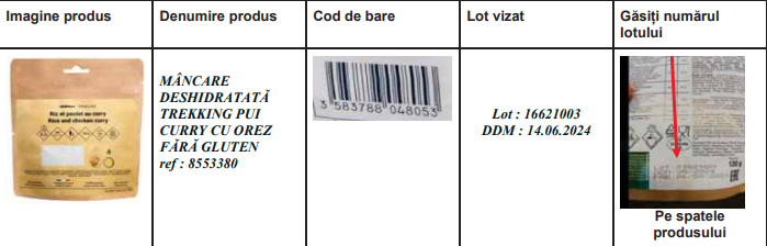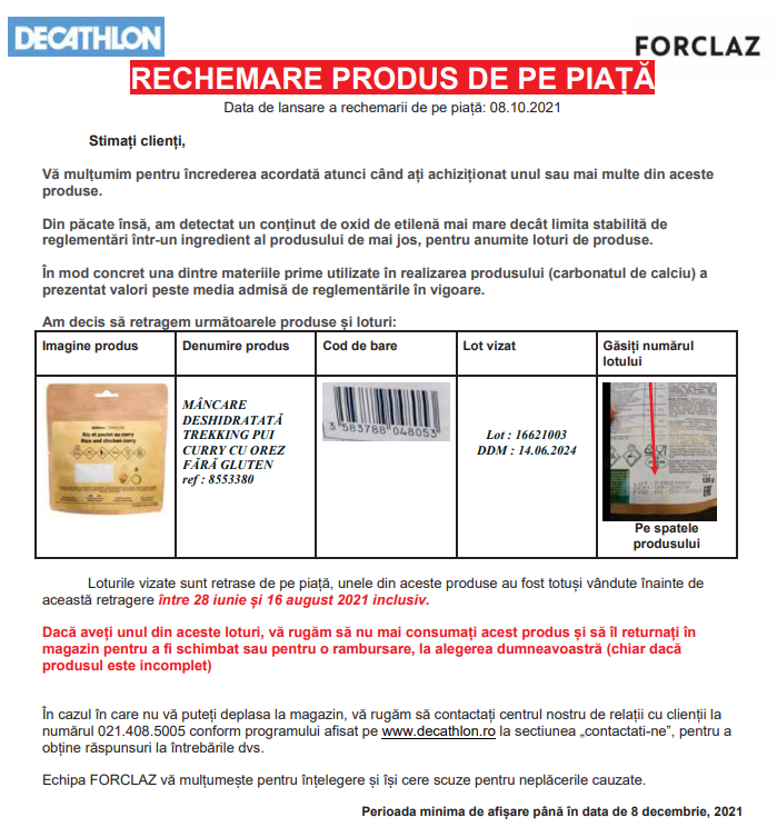 Forclaz a retras de la comercializare loturi din produsul „Mâncare deshidratată trekking pui curry cu orez fără gluten”. Produsul a fost vândut și în magazinul Decathlon din incinta centrului comercial Jupiter City Pitești.