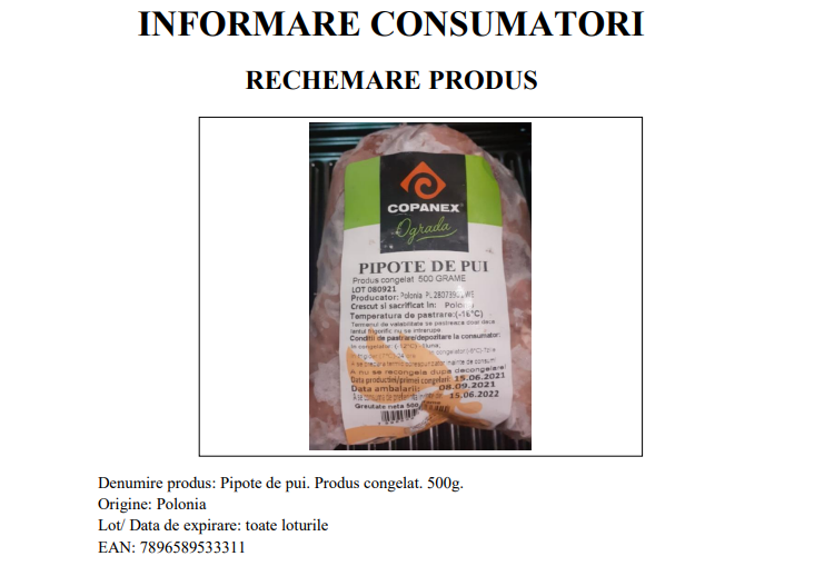 „Societatea Copanex SRL a inițiat retragerea de la comercializare a produsului Pipote de pui. Produs congelat. 500 g – origine Polonia, ca urmare a evidențierii prezenței Salmonella enteritidisla în unele dintre loturile analizate.
