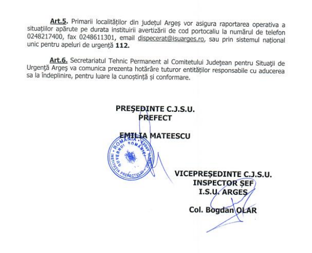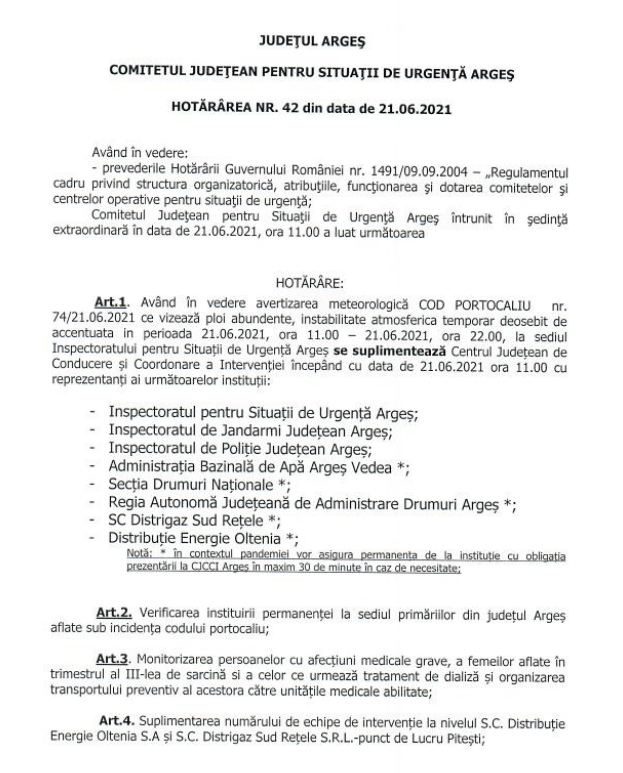 Comitetul Județean pentru Situații de Urgență (CJSU) s-a întrunit astăzi în ședință extraordinară, determinată de codul portocaliu de vreme severă sub care a intrat Argeșul. Conținutul hotărârii adoptate de CJSU (click pe imagini pentru vizualizare):