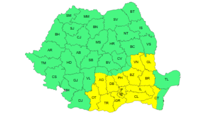 Avertizarea, emisă cu puțin timp în urmă de Administrația Națională de Meteorologie (ANM), va fi valabilă între orele 12:00 și 21:00.
