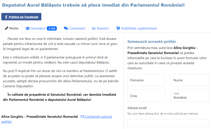 În 2022, în plin scandal sexual (aici detalii), aceeași Alina Gorghiu, pe atunci președinte al Senatului, a inițiat o petiție în care cerea demisia aceluiași Aurel Bălășoiu din Parlament: „Fiecare om face ce vrea în intimitate, inclusiv oamenii politici, însă dosare penale pentru infracțiunea de viol și acte sexuale cu minori sunt ceva ce greu îți imaginezi legat de un parlamentar. Este o infracțiune oribilă. A fi parlamentar presupune în primul rând să reprezinți un model pentru cetățeni. Nu este cazul deputatului Bălășoiu.