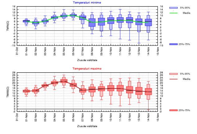 Conform sursei citate, între 5 și 7 noiembrie temperatura aerului va fi în scădere. Până la sfârșitul săptămânii viitoare, cu mici variații de la o zi la alta, media temperaurilor maxime va avea valori de 13…15 grade, iar a minimelor, de 5…7 grade.