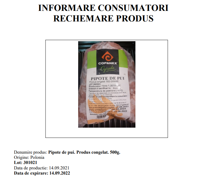 A fost inițiată retragerea de la vânzare din supermarketurile Profi a unui produs contaminat cu Salmonella: Pipote de pui, produs congelat, 500 g, origine Polonia, lotul 301021, dată de producție 14.09.2021, dată de expirare 14.09.2022.