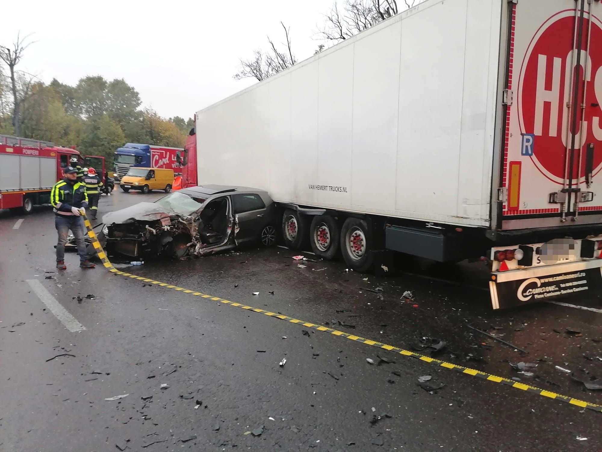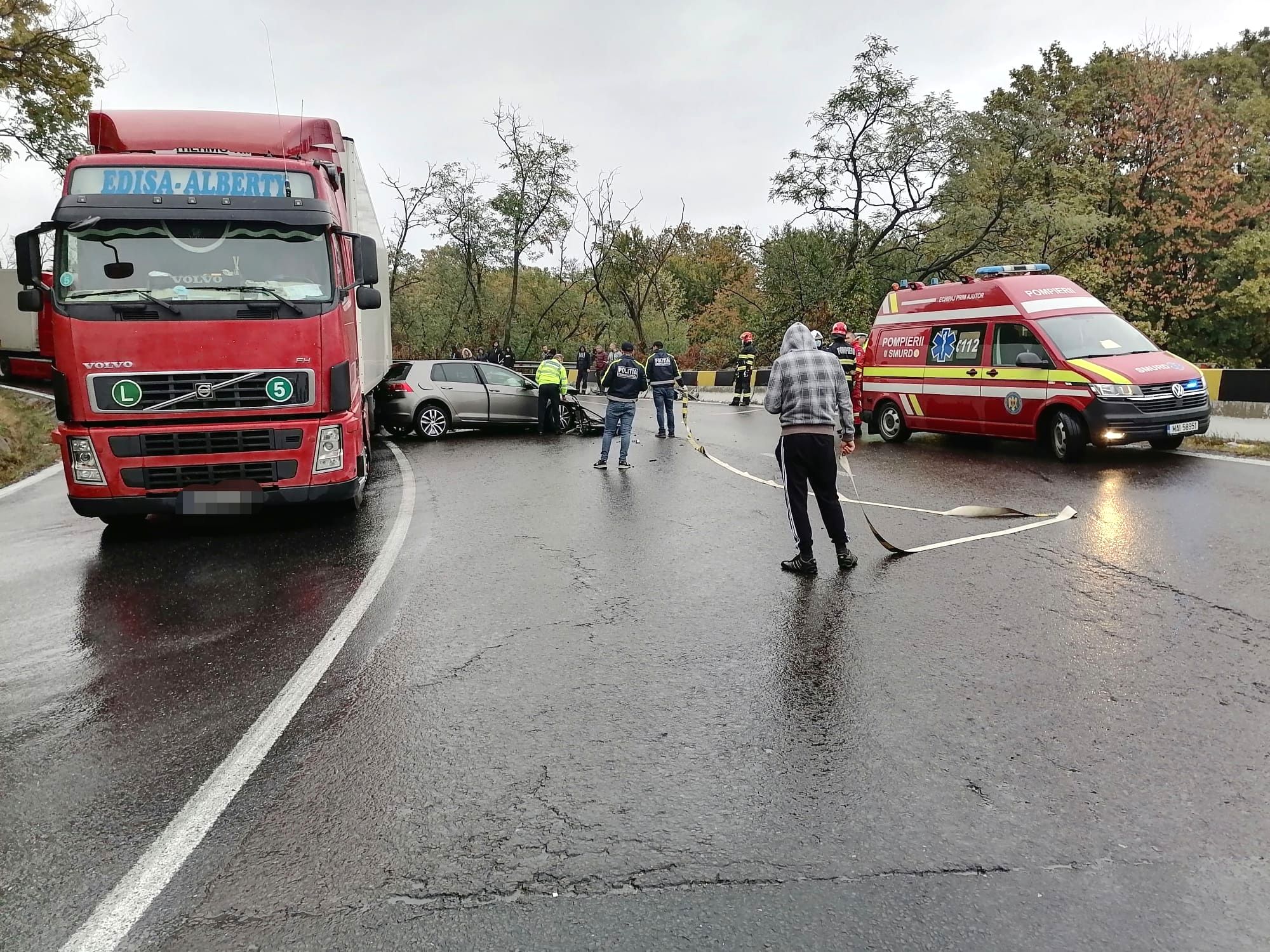 Șoferul unui TIR a pierdut controlul asupra volanului, remorca a derapat și a lovit pe contrasens un autoturism.
