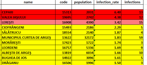 Scenariu roșu este în 3 localități (comunele Cepari, Valea Iașului și Lerești), iar scenariu galben în 8 (municipiul Curtea de Argeș și comunele Ciofrângeni, Sălătrucu, Morărești, Leordeni, Albeștii de Argeș, Bughea de Jos și Drăganu). Celelalte localități, inclusiv Piteștiul, se află în cel mai bun dintre scenariile epidemiologice, scenariul verde (click pe imagini pentru vizualizare):