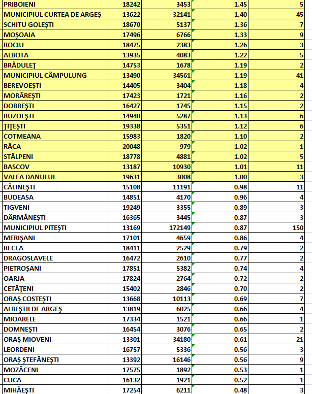 Comparativ cu situația din urmă cu 24 de ore, în municipiul Pitești rata de incidență a cazurilor de infectare cu SARS-CoV-2 a scăzut de la 0,95 la 0,87/1.000 de locuitori (click pe imagini pentru vizualizare):