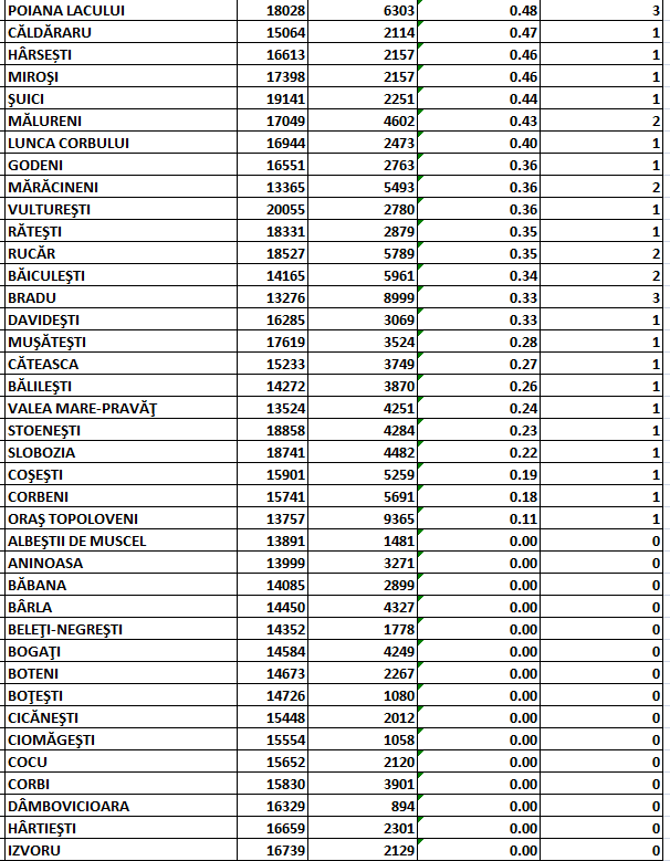 În scenariul roșu se mai află 3 localități: comunele Cepari, Valea Iașului și Lerești. Scenariu galben mai este în 7 localități: comunele Nucșoara, Bughea de Jos, Sălătrucu, Ciofrângeni, Arefu, Bughea de Sus și Drăganu.