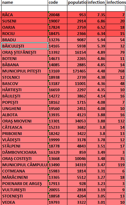 La această oră, scenariu roșu din punct de vedere epidemiologic este în 31 de localități argeșene. Localitățile aflate acum în acest scenariu, potrivit datelor comunicate de Direcția de Sănătate Publică în urmă cu puțin timp (click pe imagine pentru vizualizare):
