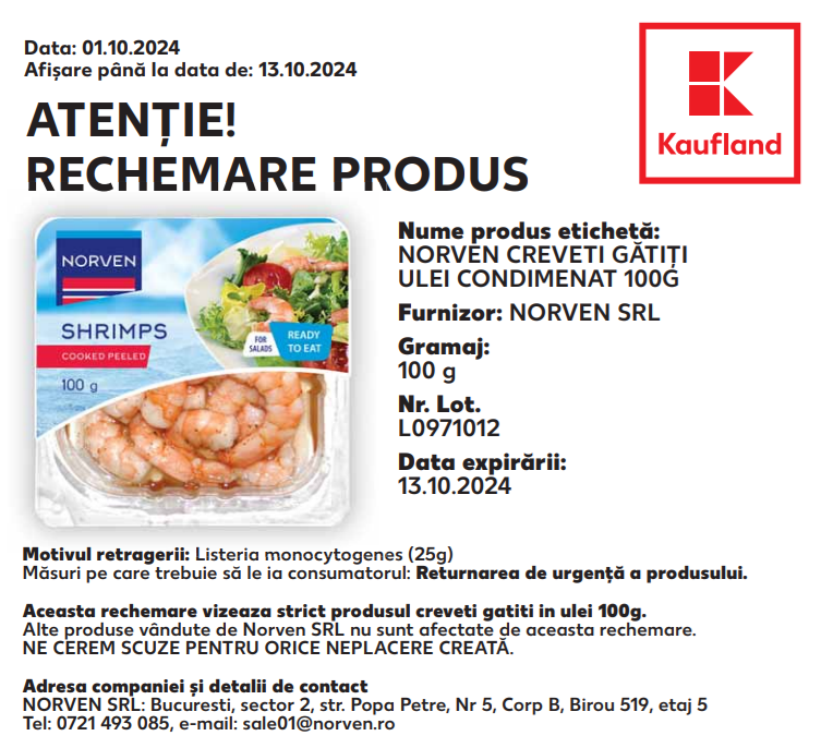 Kaufland România anunță retragerea de la comercializare a produsului ”Norven Creveți gătiți în ulei 100 g” având data de expirare 13 octombrie 2024, ca urmare a depistării bacteriei Listeria monocytogenes.