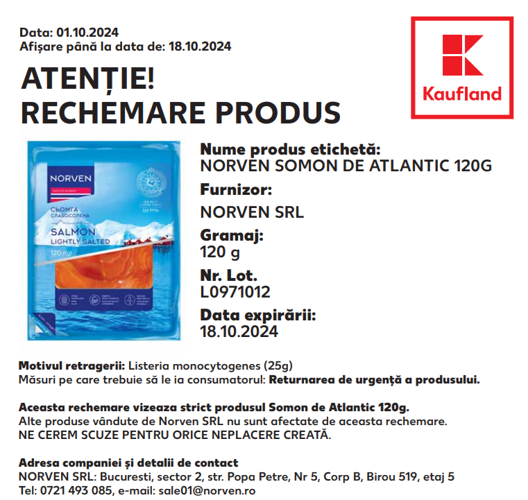 Din același motiv (prezența bacteriei Listeria monocytogenes), tot de la Kaufland a fost retras și produsul ”Norven somon de Atlantic 120 g” cu termen de expirare data de 18 octombrie 2024. Potrivit retailerului, acesta nu s-a aflat la vânzare în niciun magazin Kaufland din județul Argeș. În schimb, a fost la comercializare în magazine Kaufland din alte mari orașe, printre care București, Constanța, Ploiești, Oradea, Craiova și Galați.