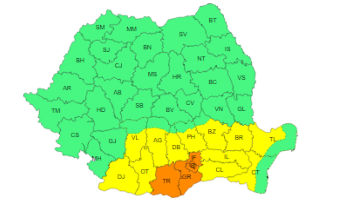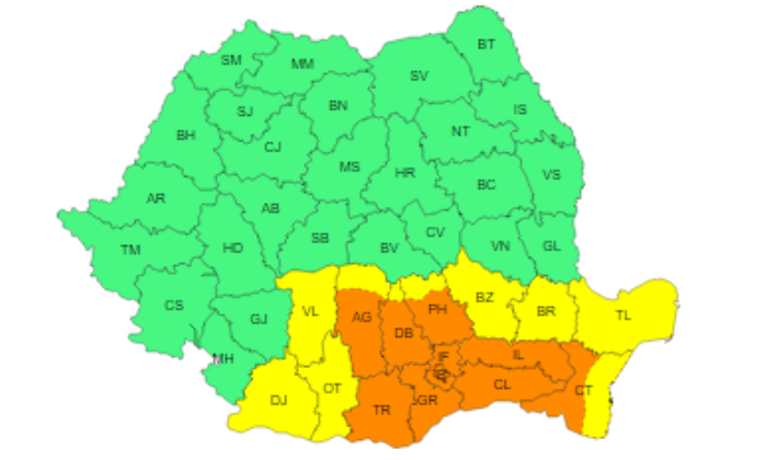În județele Teleorman, Giurgiu și Ilfov și în municipiul București vor fi caniculă și disconfort termic accentuat, iar indicele temperatură-umezeală (ITU) va depăși pragul critic de 80 de unități.