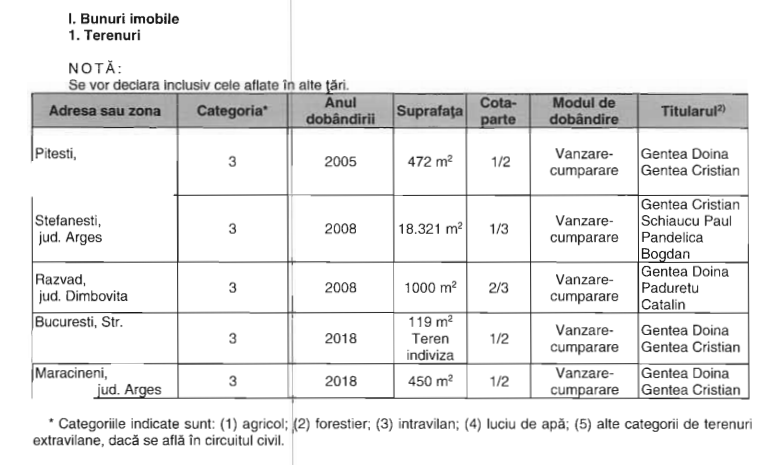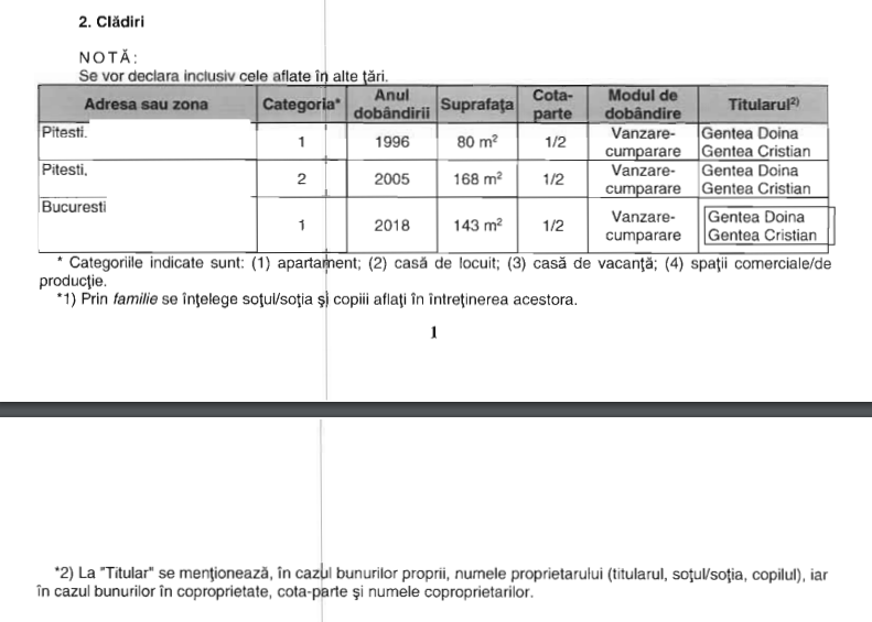 La capitolul clădiri, potrivit declarației sale de avere, Cristian Gentea și soția lui dețin un apartament și o casă de locuit în Pitești și un apartament în București. Click pe imagine pentru vizualizare: