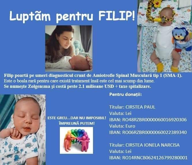 Micuțul Filip, din Pitești, poartă povara unei boli genetice rare. Este o boală care îi va afecta funcții vitale precum mersul, tusea, respiratul și înghițitul. Bebelușul are nevoie de un tratament, care, din păcate, costă foarte mult. Oamenii pot face donații pentru strângerea sumei necesare în conturile bancare deschise de părinții copilașului.