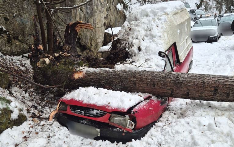 Probabil și sub greutatea zăpezii, un brad s-a prăbușit peste un autoturism. Incidentul a avut loc cu puțin timp în urmă în comuna argeșeană Dâmbovicioara.