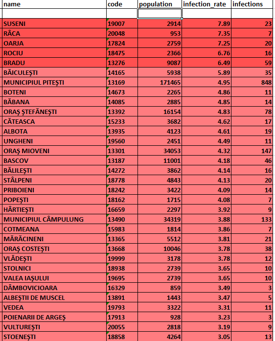 În Pitești, potrivit datelor de ultimă oră de la Direcția de Sănătate Publică Argeș, continuă să crească rata de infectare, rată care a ajuns la 4,95/1.000 de locuitori (click pe imagine pentru vizualizare):