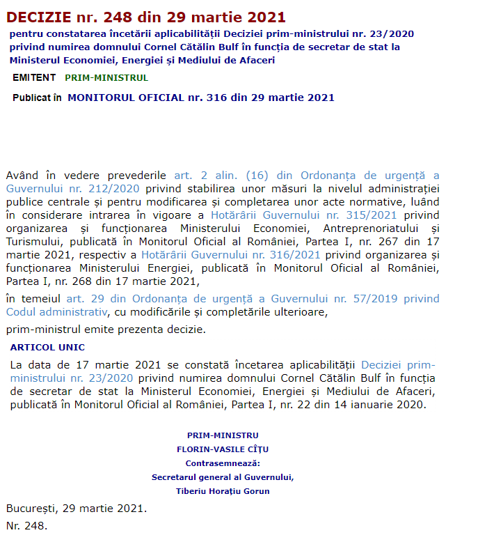 Cătălin Bulf a fost eliberat din funcția de secretar de stat la Ministerul Economiei. Decizia a fost semnată pe 29 martie 2021 de prim-ministrul Florin Cîțu.