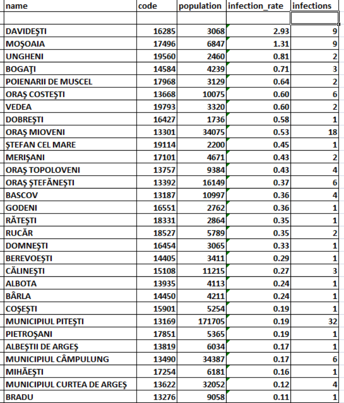 Numărul localităților din Argeș în care există cazuri active a crescut la 30, de la 28 acum 24 de ore (click pe imagine pentru vizualizare):
