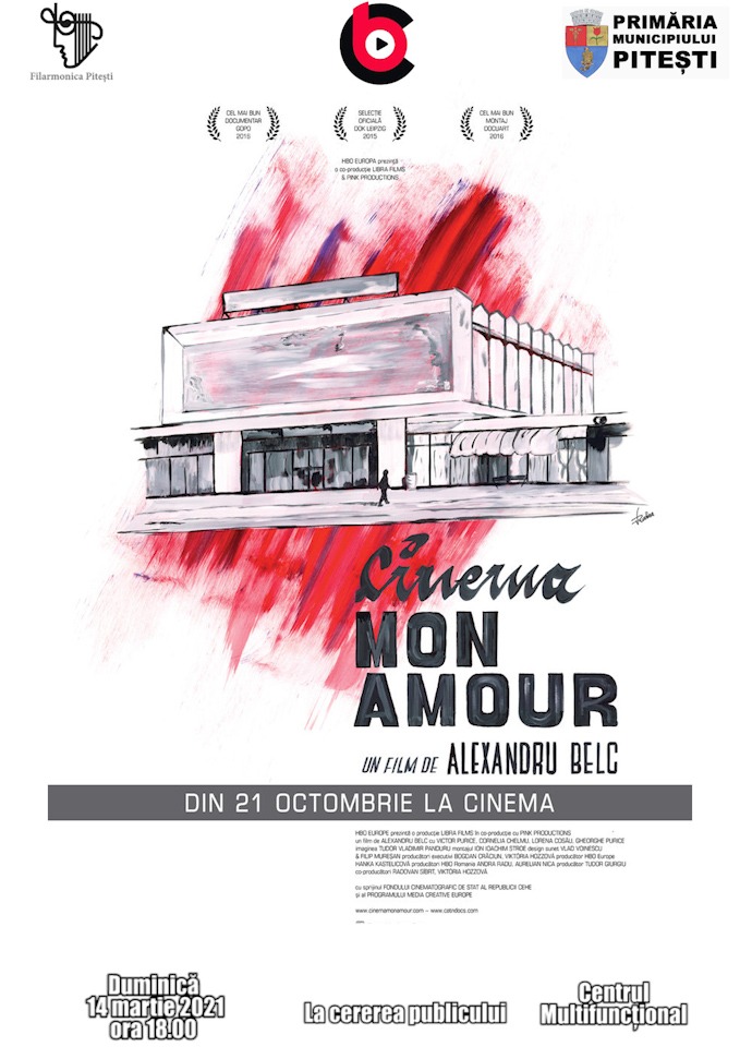 Duminică, 14 martie, tot de la ora 18:00, la Cinematograful „București” va fi redifuzat filmul „Cinema, mon amour”. Regia îi aparține lui Alexandru Belc, în rolurile principale jucând Victor Purice, Gheorghe Purice, Lorena Cosau și Cornelia Chelmu.