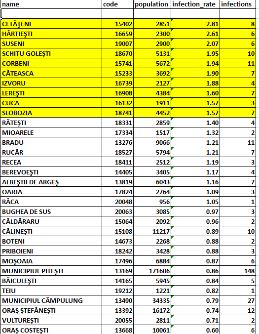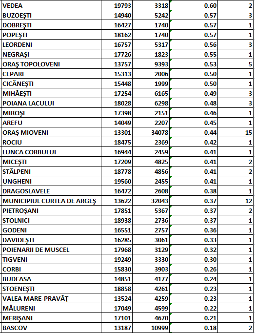 Vestea bună este că, în ultimele 24 de ore, localitatea Cetățeni a ieșit din scenariul roșu. Vestea proastă: numărul cazurilor active de infectare cu noul coronavirus continuă să crească, ajungând la 414 în întreg județul, de la 366 acum 24 de ore. De asemenea, a crescut și numărul localităților argeșene în care sunt înregistrate oficial cazuri de COVID-19: de la 62 la 66: