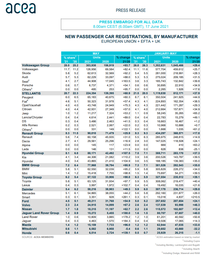 În primele cinci luni ale acestui an, în țările UE, Marea Britanie și țările EFTA au fost înmatriculate 147.025 de mașini Dacia, cu 24,1% mai multe decât în perioada similară a anului trecut (perioadă – de început de pandemie în Europa – în care au fost înmatriculate doar 118.508 autoturisme noi Dacia).