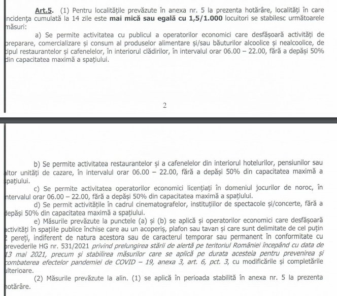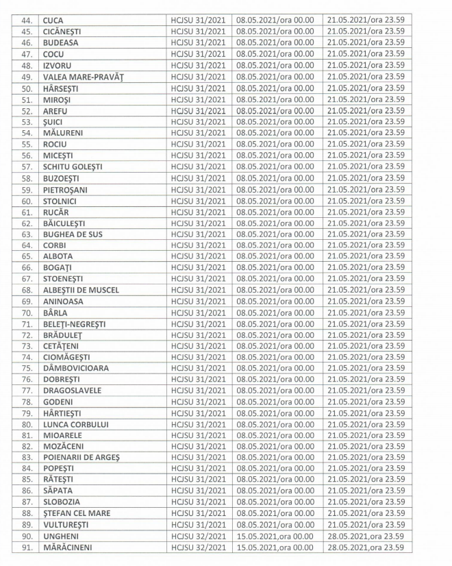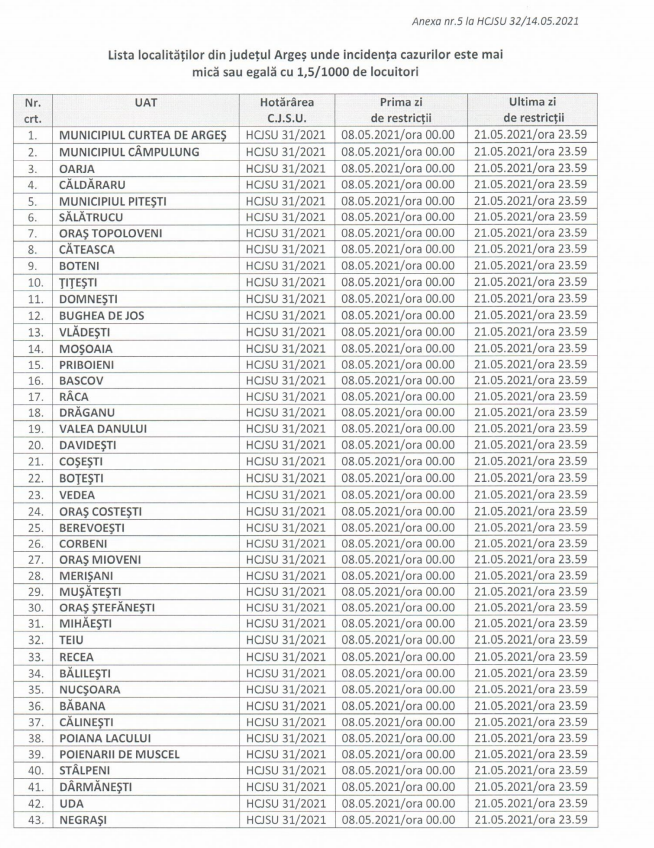 Măsura vizează restaurantele/cafenelele, sălile de jocuri de noroc, cinematografele și sălile de concerte din municipiul Pitești și din alte zeci de localități argeșene (91 dintre cele 102 localități ale județului), în care rata de incidență cumulată în ultimele 14 zile a cazurilor de infectare cu SARS-CoV-2 este mai mică sau egală cu 1,5/1.000 de locuitori (click pe imagini pentru vizualizare):