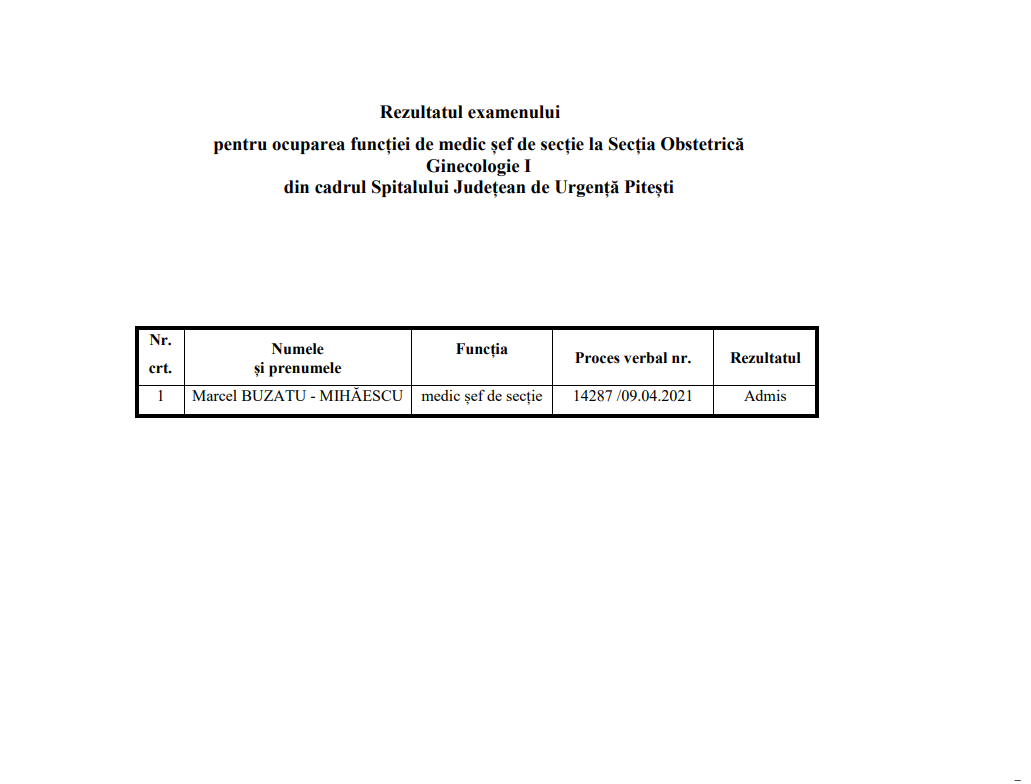 Doctorul Marcel Buzatu Mihăescu rămâne medic-șef al Secției de Obstetrică Ginecologie I a Spitalului Județean de Urgență (SJU) din Pitești. Buzatu a fost declarat admis la examenul organizat de spital luna trecută pentru funcția respectivă (click pe imagine pentru vizualizare):