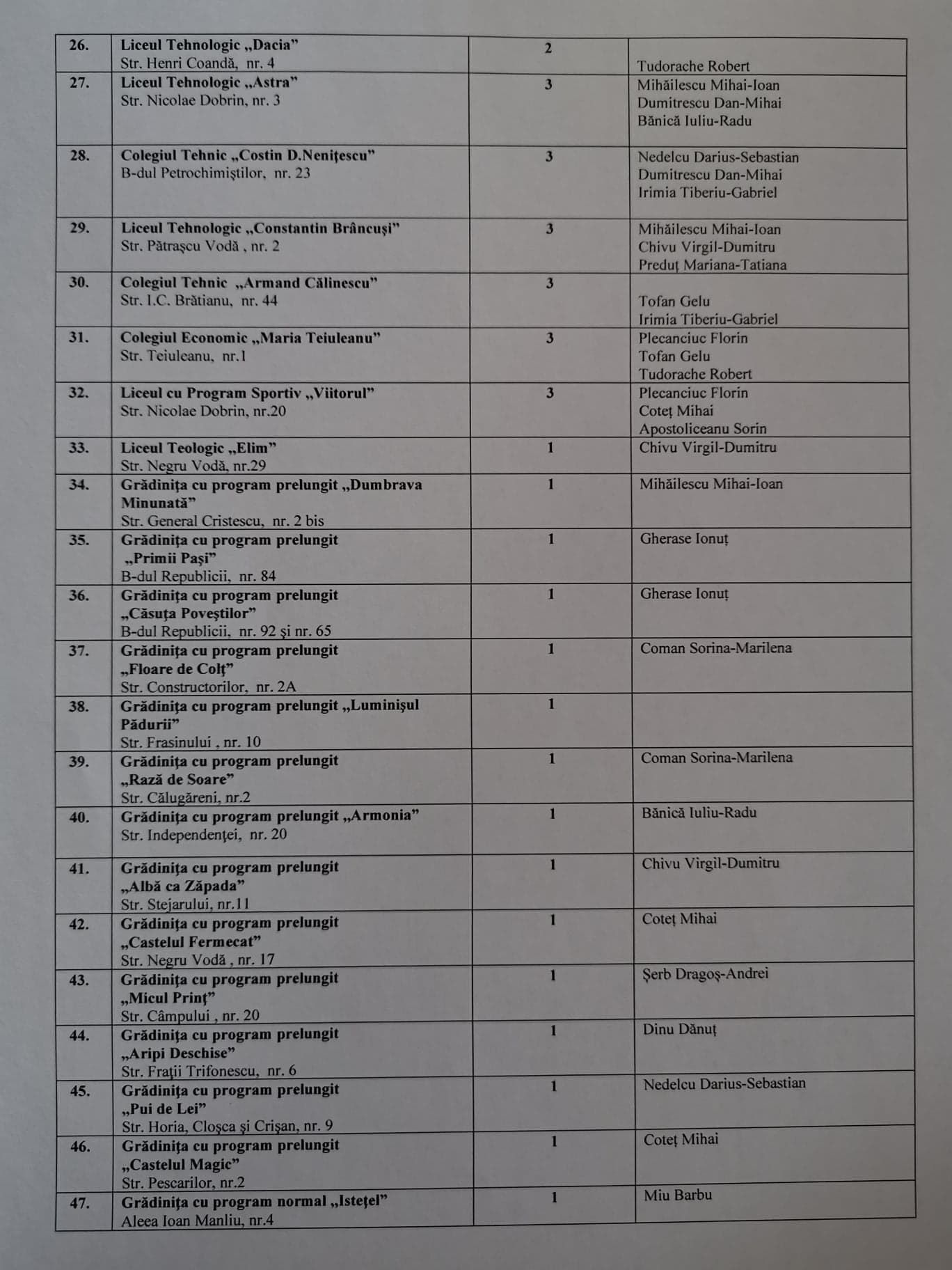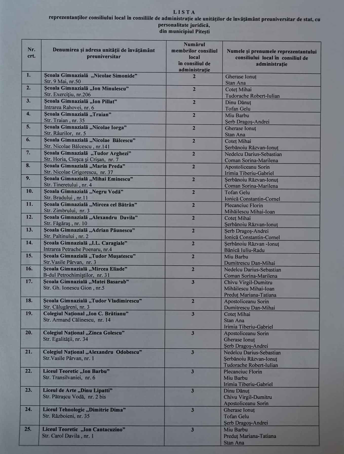 Lista aproape finală cu numele reprezentanților noului Consiliu Local în consiliile de administrație ale unităților de învățământ preuniversitar de stat din Pitești a fost stabilită în ședința pe comisii. Urmează ca decizia să fie luată în ședința în plen de astăzi a Consiliului Local (click pe imagini pentru vizualizare):