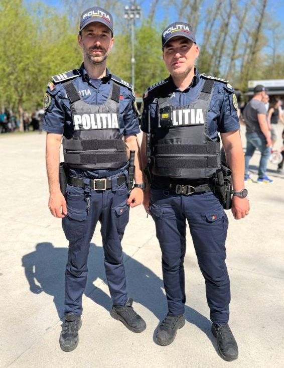 Cei doi polițiști (foto) au preluat imediat cazul. Au liniștit copilul și au încercat să obțină informații utile. Au urcat pe scena de spectacol și au făcut un anunț pentru identificarea aparținătorilor, transmițându-le totodată și celorlalte forțe de ordine prezente la Simfonia Lalelelor datele cunoscute, pentru a avea cazul în atenție.