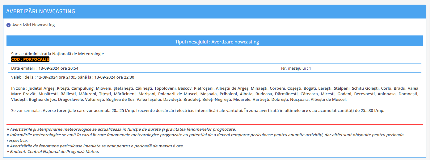 Precizăm încă o dată: înainte și în timpul vijeliei care a inundat străzi și a doborât copaci, Administrația Națională de Meteorologie NU a emis nicio avertizare de tip nowcasting pentru Pitești și celelalte localități afectate, iar piteștenii NU au primit nicio alertă pe telefoane. Mesajul RO-Alert a fost emis ulterior, abia pentru intervalul orar 21:05-22:30, după ce partea cu adevărat puternică a furtunii deja trecuse.
