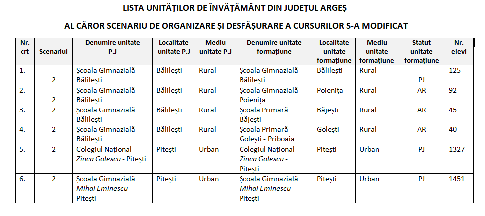 Hotărârea CJSU (de trecere în scenariul 2) vizează și Școala „Mihai Eminescu” din Pitești și școlile gimnaziale din comuna Bălilești (din satele Bălilești, Poienița, Băjești și Golești):