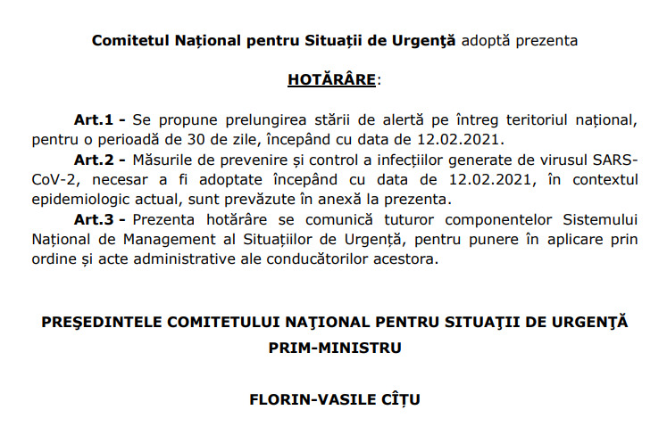 Comitetul Național pentru Situații de Urgență (CNSU) a hotărât astăzi să propună prelungirea cu încă 30 de zile a stării de alertă. Măsura va intra în vigoare pe 12 februarie 2021.