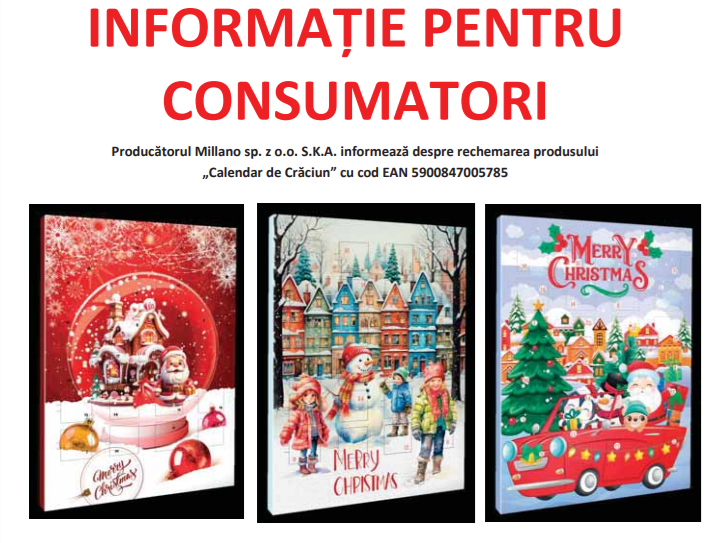 ”Millano sp. z o.o. S.K.A. regretă să vă informeze că, din cauza unei modificări senzoriale – gust nespecific, care nu reflectă calitatea și savoarea standard a produsului, toate loturile de calendare de Crăciun livrate în magazinele Lidl România, după cum sunt prezentate în imaginile de mai jos, sunt rechemate de la consumator.