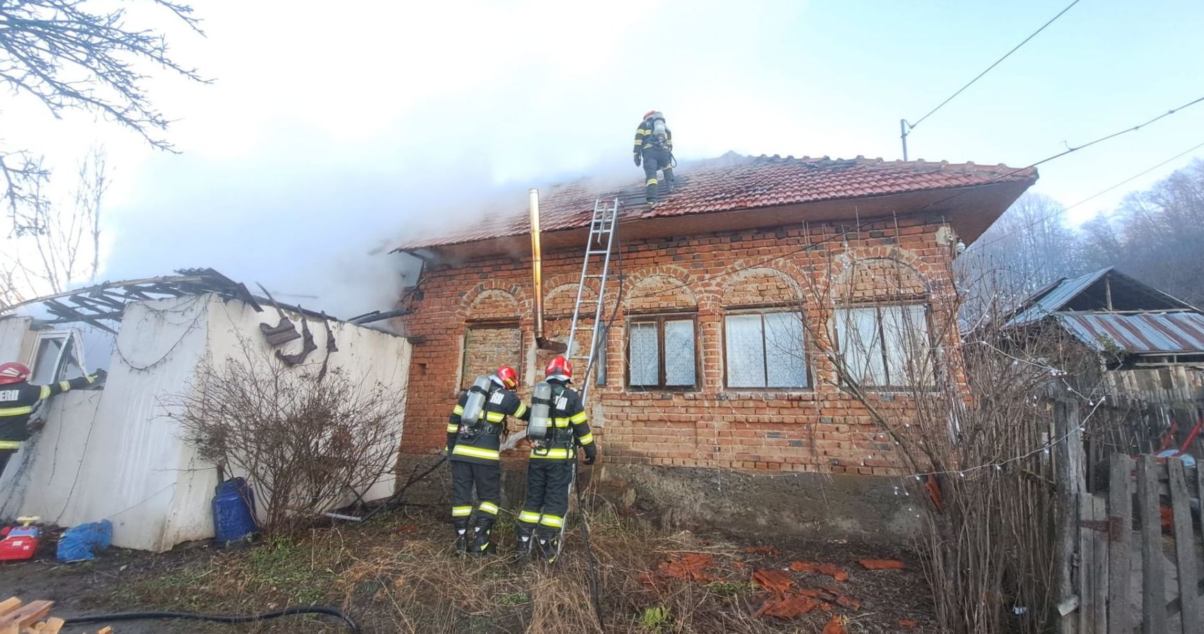 Este vorba despre un incendiu care se manifestă generalizat la acoperișul unei case și la o anexă, pe o suprafață de aproximativ 100 de mp.