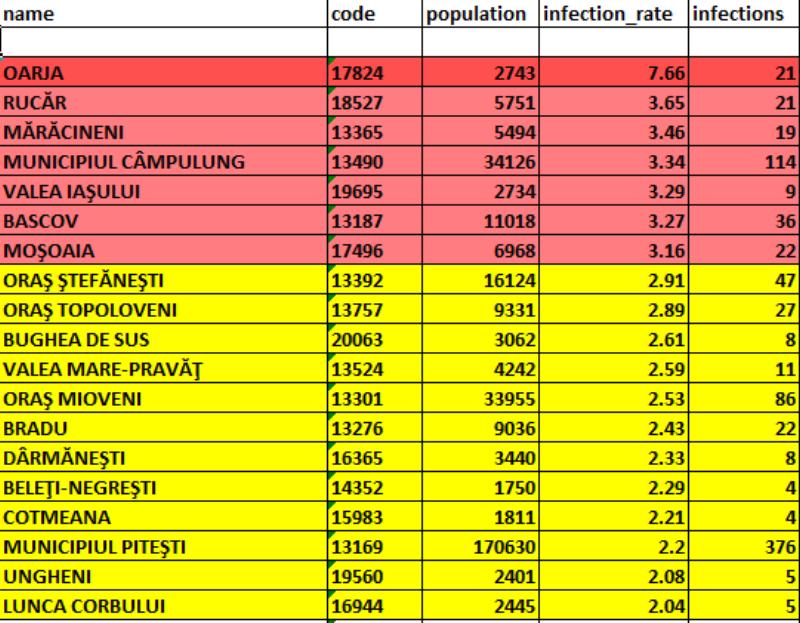Potrivit datelor transmise în această dimineață de Direcția de Sănătate Publică (DSP), a crescut și numărul localităților din județul Argeș care se află în scenariul roșu, de la 3 la 7: municipiul Câmpulung și comunele Oarja, Rucăr, Mărăcineni, Valea Iașului, Bascov și Moșoaia.