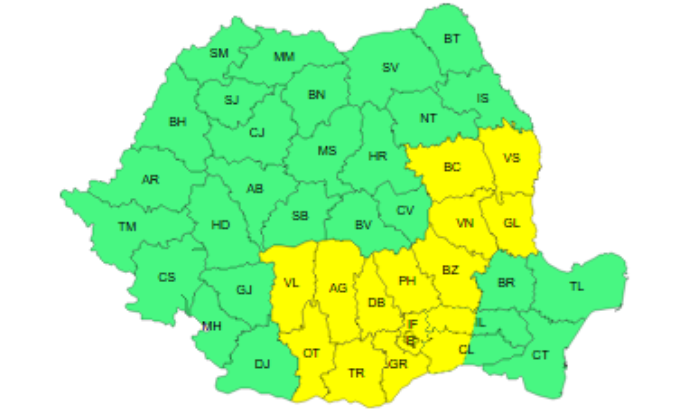 Avertizarea a intrat în vigoare azi-dimineață, la ora 10:00, și va fi valabilă până diseară, la ora 23:00.