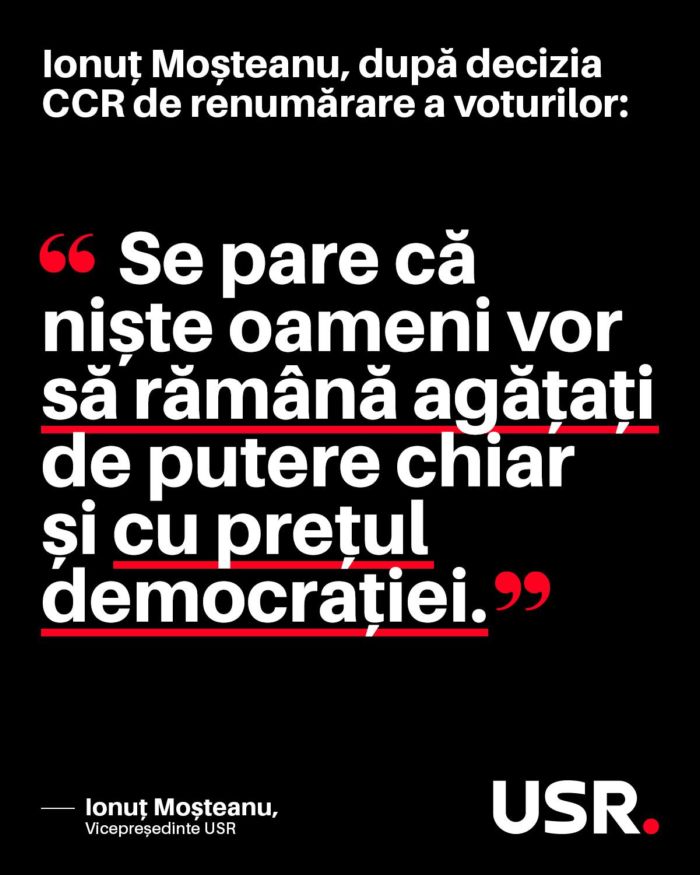 În această seară, cu puțin timp în urmă, Ionuț Moșteanu, vicepreședinte USR, liderul deputaților USR și parlamentar de Argeș, a transmis un mesaj în contextul deciziei de astăzi a Curții Constituționale de renumărare a voturilor exprimate în toate secțiile de votare în primul tur al alegerilor prezidențiale.