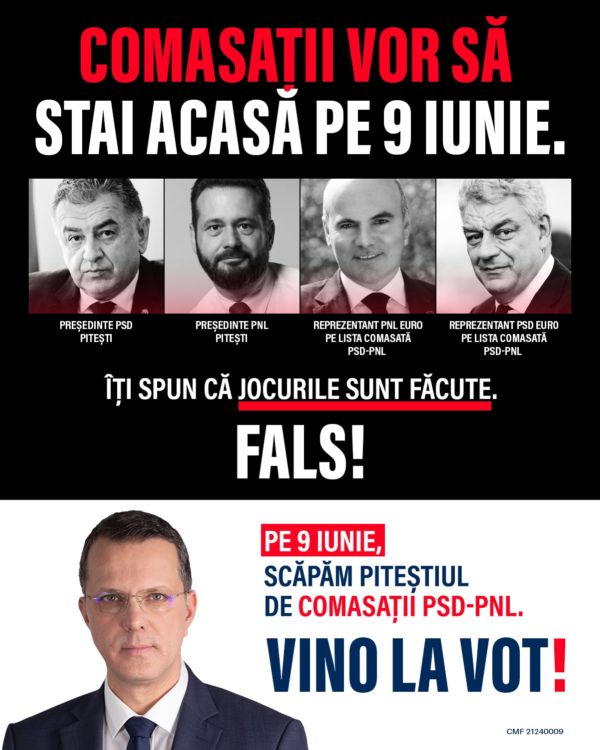 Pe 9 iunie, piteșteni, veniți la vot! Vorbiți cu prietenii care nu sunt convinși să o facă, aduceți cu voi cinci apropiați. Suntem aproape să câștigăm, dar pasul cel mai important trebuie făcut pe 9 iunie. Mergem la vot! Mergem la victorie! Se poate!”.