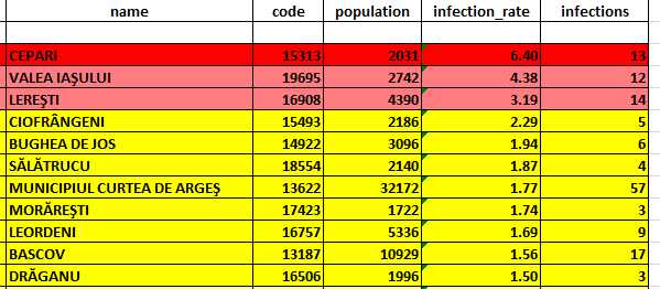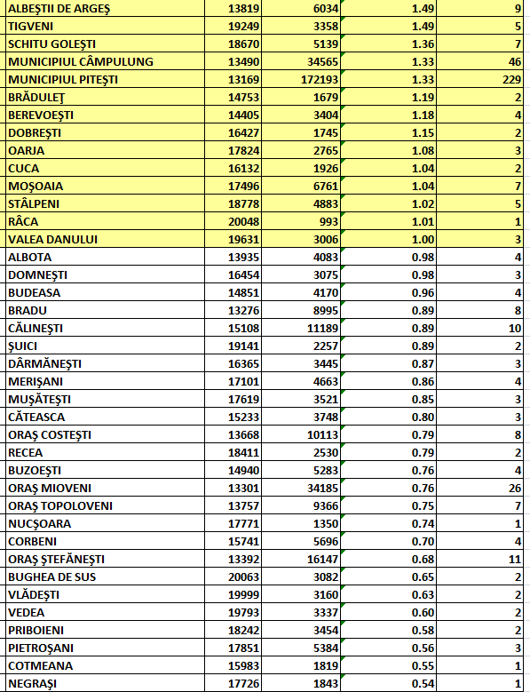 În ultimele 24 de ore, în Pitești rata de infectare cu SARS-CoV-2 a scăzut de la 1,35 la 1,33 la mia de locuitori (click pe imagini pentru vizualizarea listei):