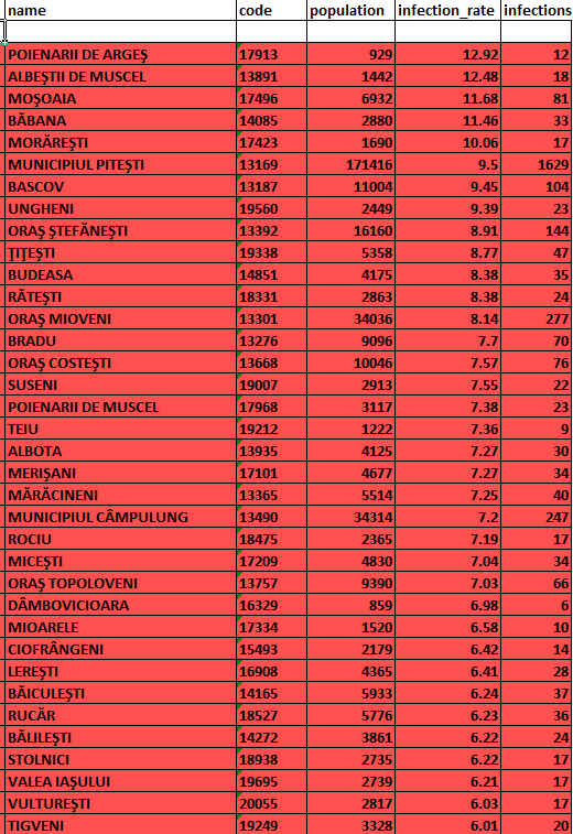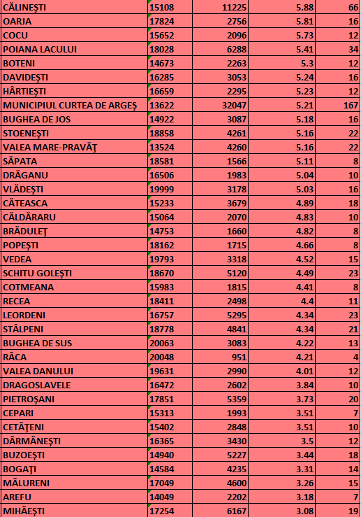 Lista actualizată azi, 16 octombrie, a localităților din județul Argeș cu cele mai mari rate de infectare, aflate – din punct de vedere epidemiologic – în scenariul roșu (click pe imagini pentru vizualizare):