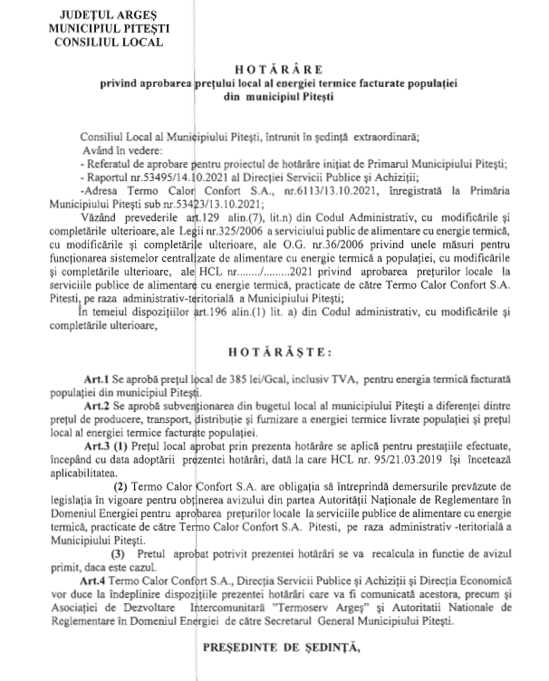 Marți, 19 octombrie, în ședință extraordinară, Consiliul Local Pitești va aproba majorarea prețului la energia termică furnizată în sistem centralizat pentru populație. Noul preț propus este de 385 de lei (inclusiv TVA) pe gigacalorie (click pe imagine pentru vizualizare):