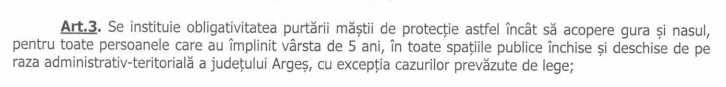 Purtarea măștii în aer liber în TOATE spațiile publice deschise devine obligatorie în TOATE localitățile din județul Argeș, indiferent de rata de infectare cu noul coronavirus din localitatea respectivă.