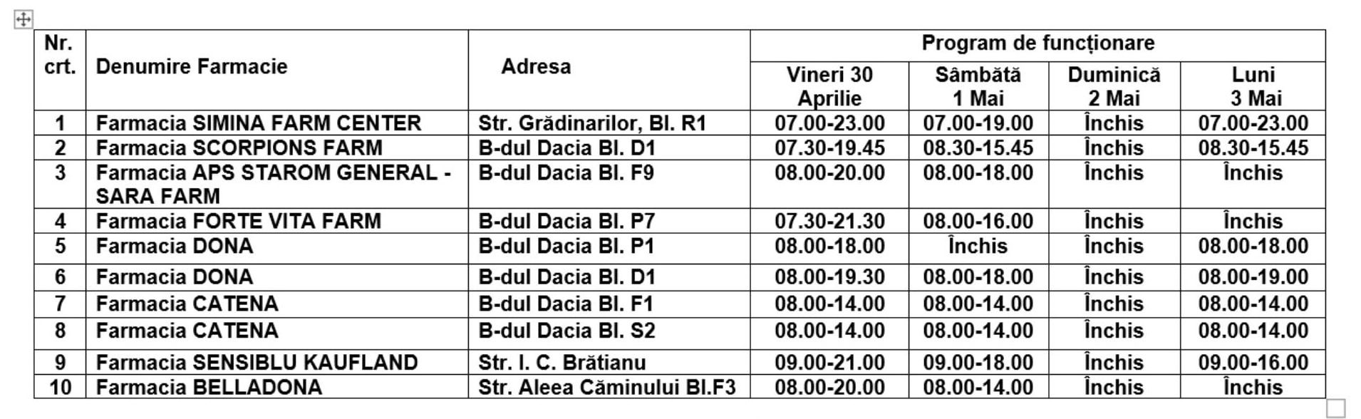 Anunț de interes pentru locuitorii orașului Mioveni și din zonele limitrofe. Între 30 aprilie și 3 mai 2021, în perioada minivacanței de Paște și de 1 mai, farmaciile din Mioveni vor avea un program special (click pe imagine pentru vizualizare):