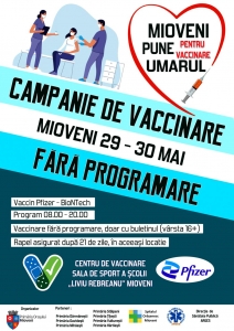 Campania, vă reamintim, se va desfășura sâmbătă, 29 mai, și duminică, 30 mai, între orele 08:00-20:00, la Centrul organizat în sala de sport a Școlii „Liviu Rebreanu” și li se adresează persoanelor cu vârsta de peste 16 ani. Centrul este pregătit să îi primească pe cei care vor să se imunizeze împotriva COVID-19.